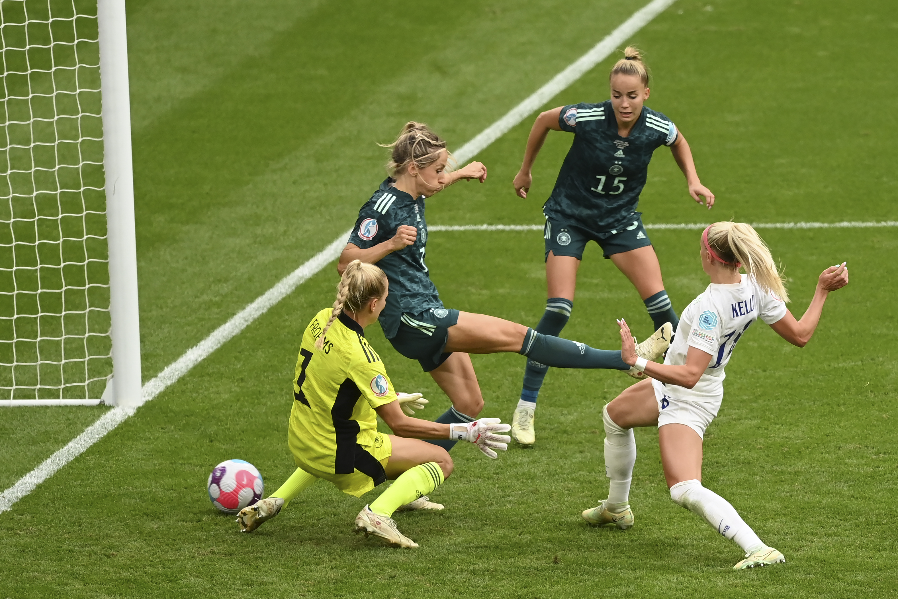 Chloe Kelly scores the winning goal for England. (Getty)