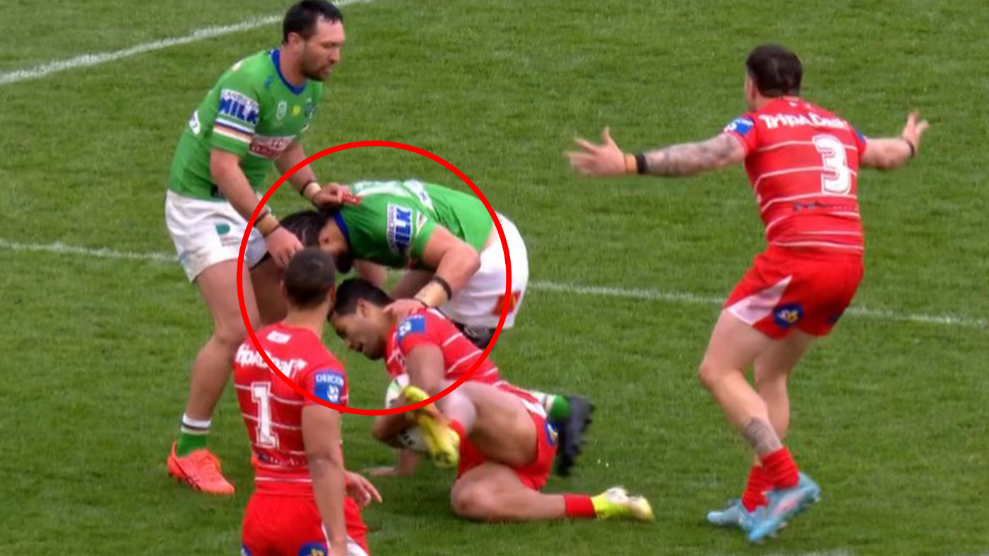 He was bought down by Sebastian Kris and Corey Harawira-Naera, who appeared to linger on the Dragons winger a little too long before Feagai lost the ball.