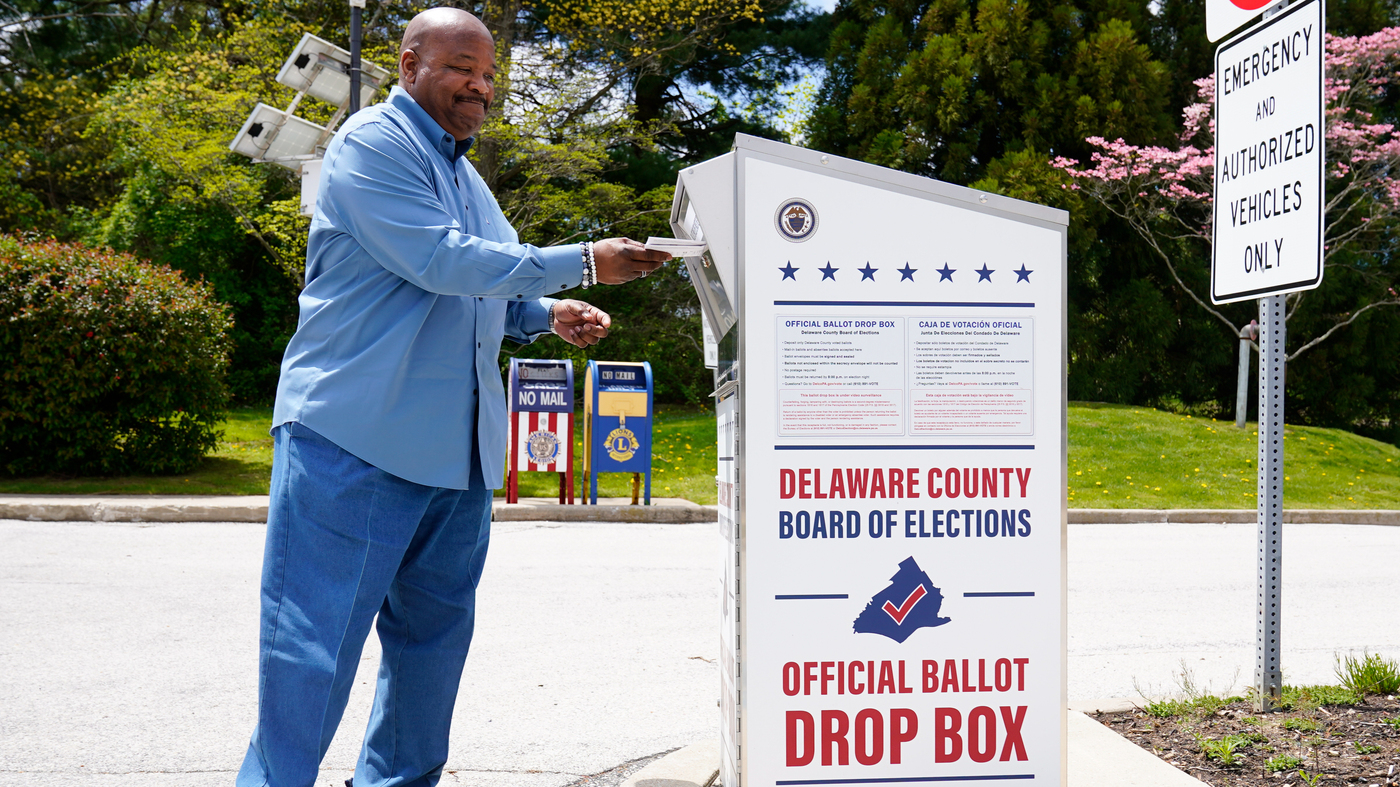 A voter drops off his mail ballot for the 2022 Pennsylvania primary elections in Newtown Square, Pa., on May 2. The state’s Supreme Court has ruled in a lawsuit challenging the constitutionality of a state law that expanded mail-in voting.